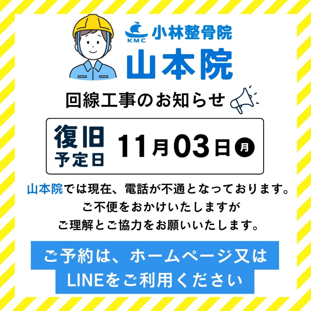 現在、山本院では回線工事の影響により、電話が一時的にご利用いただけない状況となっております。復旧は11月03日(月曜日)を予定しております。