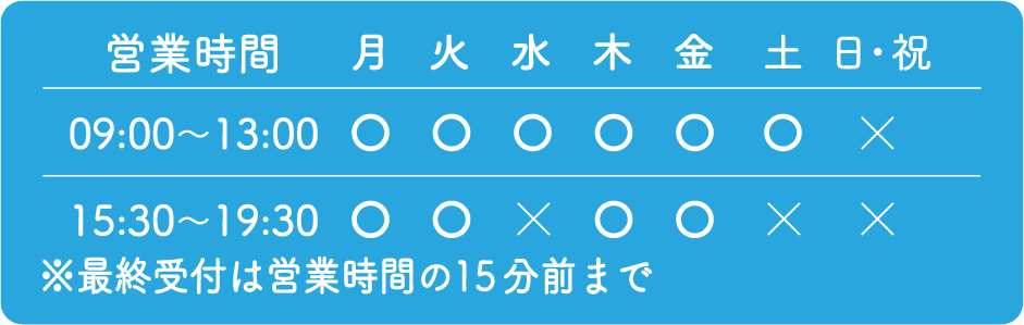 | 診療時間 | ◆ 月・火・木・金 午前 09:00~13:00、午後 15:30~19:30 ◆ 水・土 午前 09:00~13:00、午後 休診 ※ 休診日:日曜日、祝日 ※ 最終受付は営業時間の15分前まで |