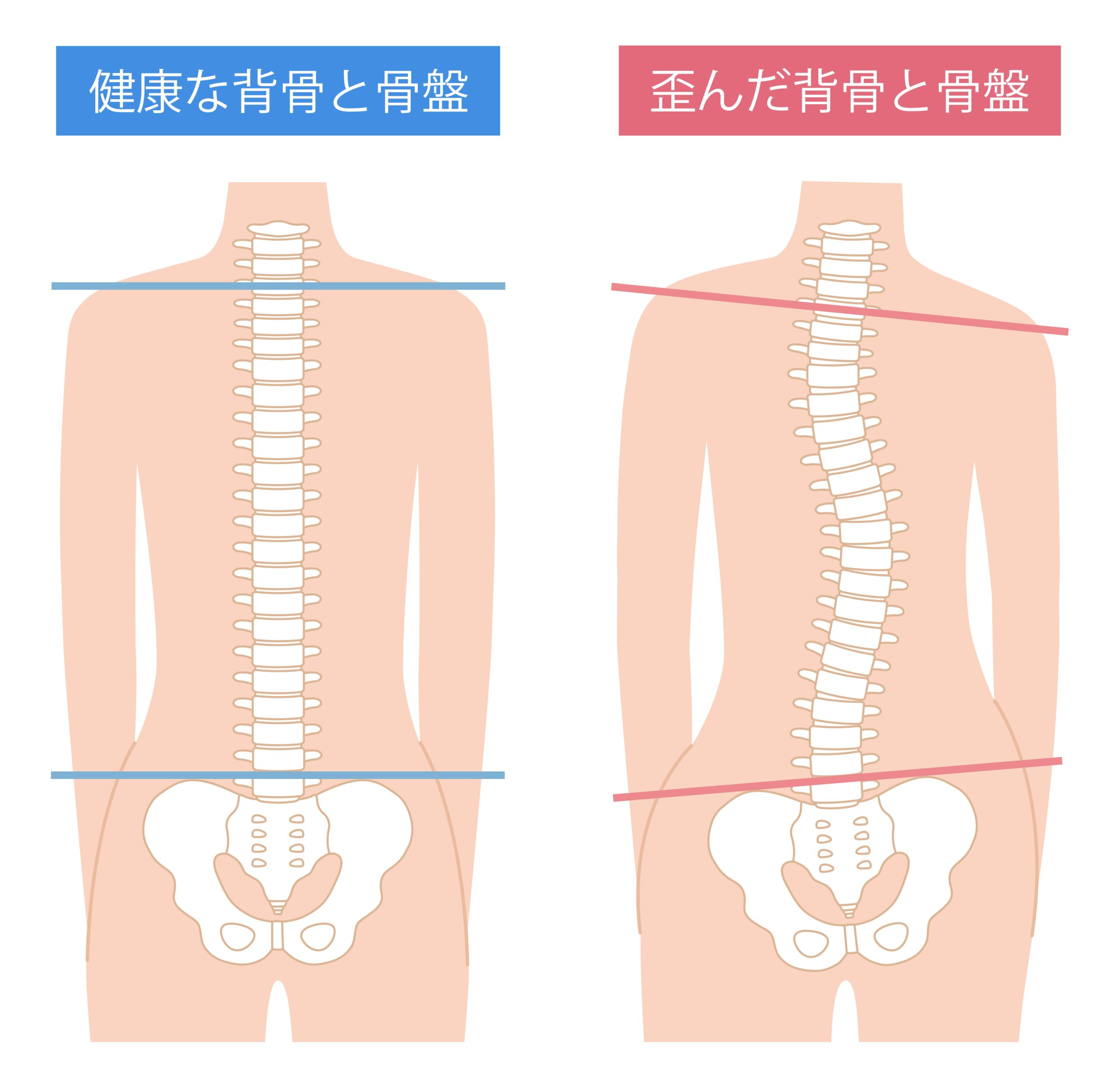 側弯症は、背骨が左右に曲がりながらねじれてしまう状態のことです。正常な背骨はまっすぐですが、側弯症になると背中や腰が左右に歪んで見え、体のバランスが崩れます。