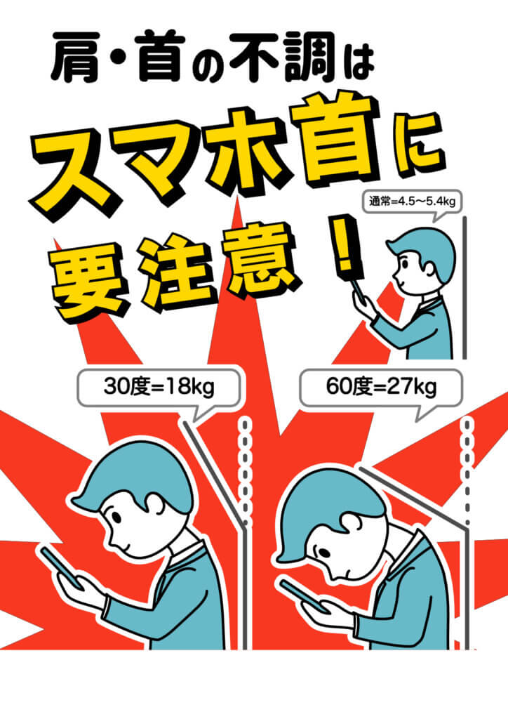 長時間、うつむいた姿勢でスマホやパソコンを見る。頭の重さ(約5〜6kg)が首に真下からかかり続ける。※頭が前に3cm出るごとに、首にかかる負担は倍増すると言われています。