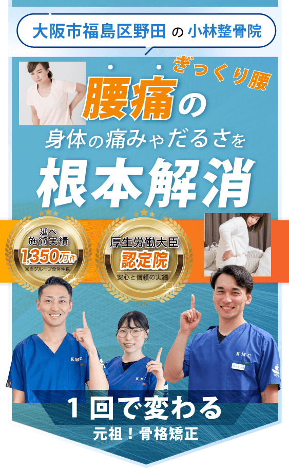 設立より40年を越え、腰痛・ぎっくり腰治療の様々な実績がございます。KMC小林整骨院グループは、短期間で改善を期待できる独自の「小林式矯正法」により、身体に生じた腰痛等の症状や原因を根本改善してまいりました。また、患者様がお身体の治療に専念出来るように、自宅での運動指導など症状改善に向けて、お悩みやご相談にも対応いたします。